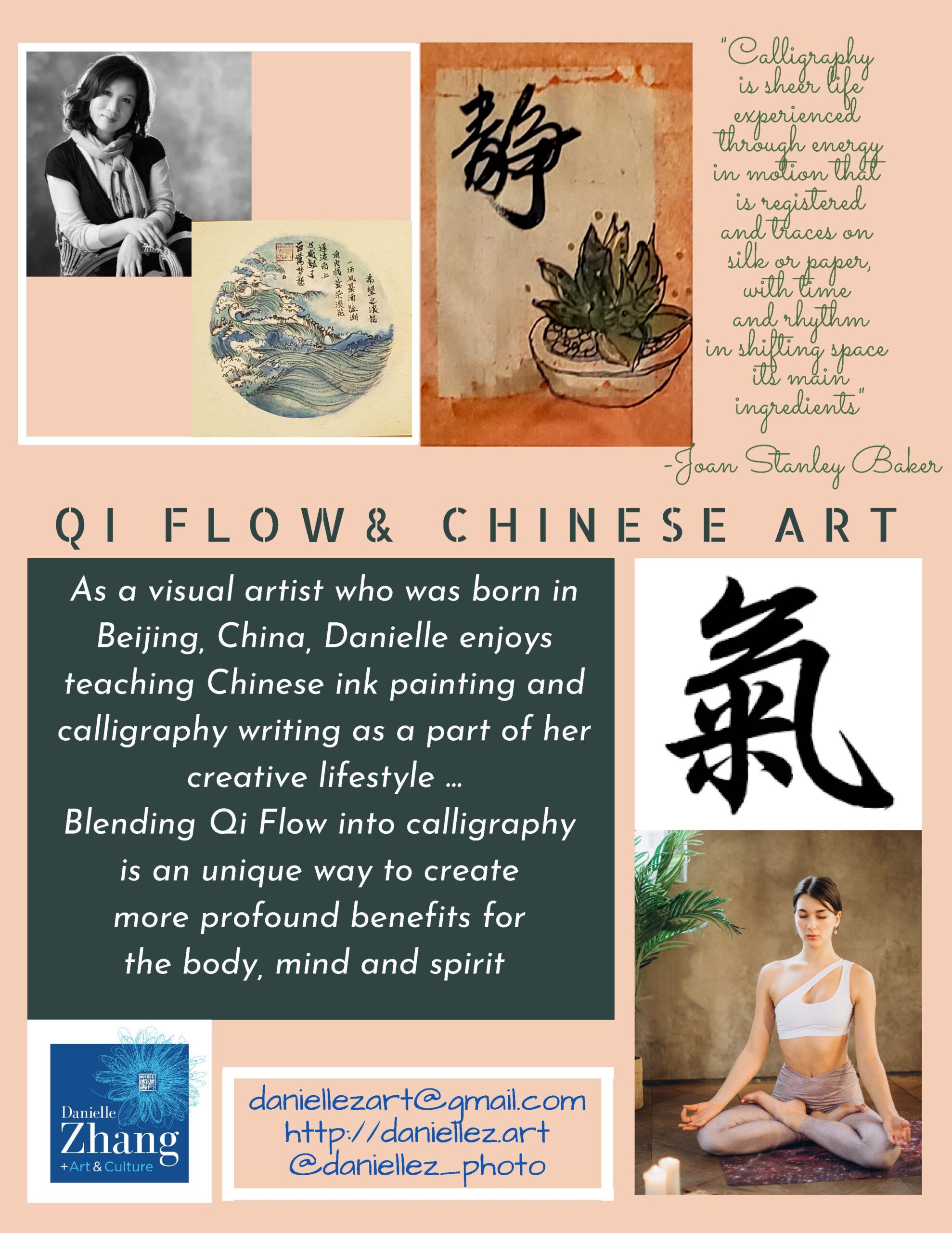As a visual artist born in Beijing, China, I find joy in teaching Chinese ink painting and calligraphy as part of my creative lifestyle. Blending Qi flow into calligraphy provides a unique avenue to cultivate profound benefits for the body, mind, and spirit.